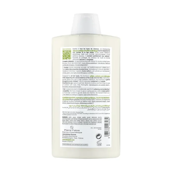 Formulé pour prendre soin des cheveux de toute la famille même ceux des plus petits, le Shampoing au lait d’Avoine de Klorane nettoie en douceur tous les types de cheveux. Haute tolérance, sa formule biodégradable* testée sous contrôle dermatologique et pédiatrique respecte l’équilibre des cuirs chevelus délicats. En offrant aux cheveux un véritable bain de douceur, ce Shampoing doux facilite le démêlage grâce aux propriétés adoucissantes et protectrices du lait d’Avoine, issu de culture BIO. Propres, hydratés et protégés, les cheveux retrouvent douceur*** et souplesse**.*Selon la norme OCDE 301B.**Cheveux souples : 86 % de satisfaction – test de satisfaction auprès de 49 utilisatrices habituelles du shampoing Klorane au lait d’avoine.***Cheveux doux : 90 % de satisfaction – test de satisfaction auprès de 49 utilisatrices habituelles du shampoing Klorane au lait d’avoine.